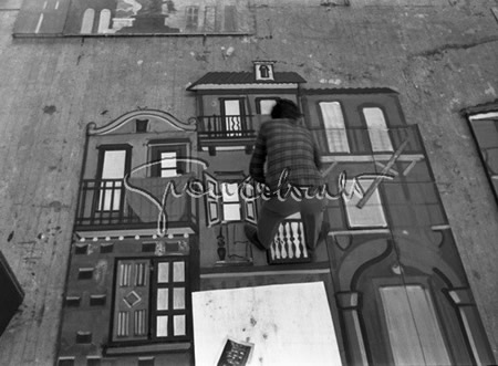 Scenografi al lavoro negli studi RAI. Milano, 1954